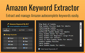 Ekstensi ini menawarkan berbagai alat pengolahan kata kunci seperti menambahkan prefiks/sufiks, menemukan dan mengganti istilah secara massal, serta memformat kata kunci dalam berbagai gaya huruf. Semua pemrosesan kata kunci dilakukan secara lokal di browser, sehingga data pengguna tidak pernah dikirim atau disimpan secara eksternal. Amazon Keyword Extractor adalah solusi ideal untuk penulis KDP, peneliti produk, pemasar afiliasi, pengiklan PPC Amazon, dan profesional SEO.